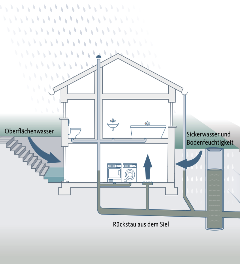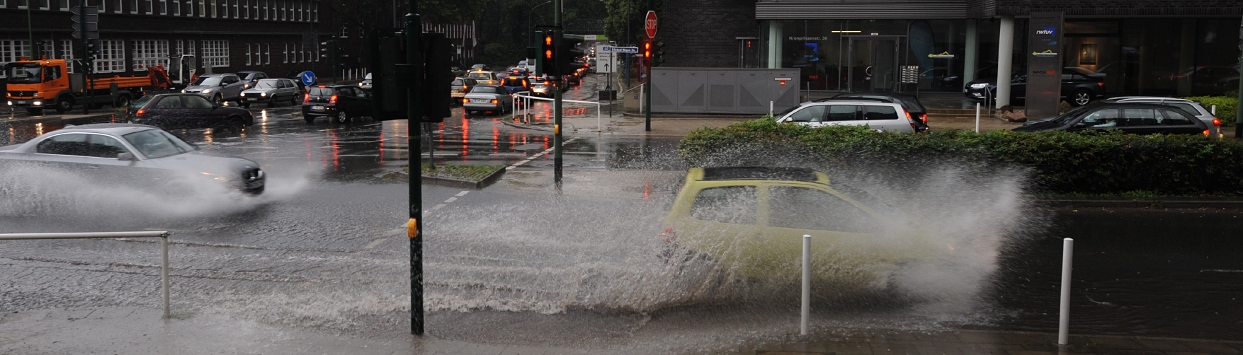 Unwetterartige Niederschläge können überall und auch abseits von größeren Flüssen zu dramatischen Überflutungen und Gefahren für Leib und Leben sowie Schäden an Gebäuden und Fahrzeugen führen.